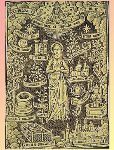 "Thou art all fair my love, and there is no spot in thee." Surrounding the Blessed Virgin - portrayed here as the Immaculate Conception, as a young maiden prior to the Incarnation - are her emblems and the biblical phrases, in medieval Latin, which I have tried to translate to english, the image is very poor(I blew the picture up has large as I could then went to find a latin to english dictionary, actually medieval latin, so hopefully these is correct)