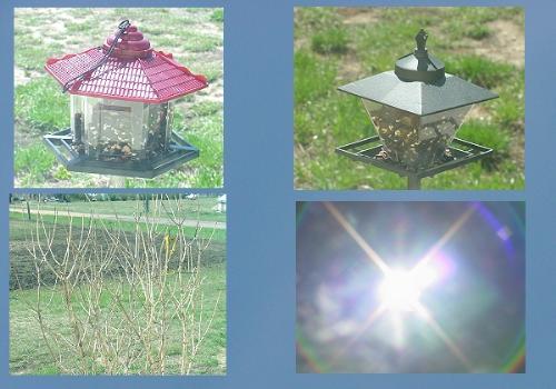 Nice suuny day, still to wet to dig my post holes, we got about 1.75 inches of rain. The tree you see I found, so while the ground was wet I dung a deep hole planted it. The background is todays sky and the bird feeders have bird seed in them.. |