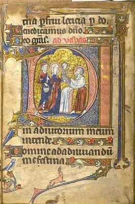 The scene in the initial is the Presentation of Christ in the Temple and derives from the scriptural account in Luke 2.22-35.