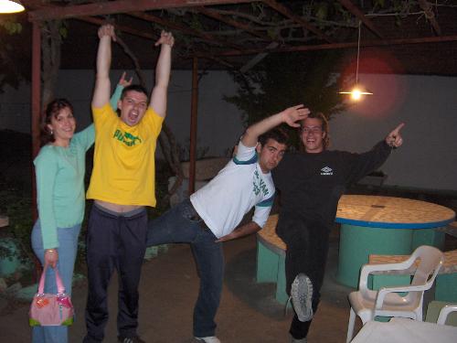 Bueno, de izquierda a derecha: Esther, que siempre nos sufre pero que en el fondo nos aprecia (muy en el fondo). Fidel el showman, este tio es la P.P (Pijus Magnificus en latín). Raul, gran amigo y apañero desde hace mucho (Se me ha afloreado un poco desde lo del "Casa en Ingles"). Y por ultimo y no menos mareado Ruben, ese dia lo sembro el mamón. Estos son 4 de las personas a las que tengo el placer de llamar Amigos. |
