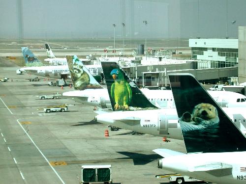The tails of the Frontier planes all have different animals on them. We flew on Frontier.