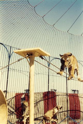 Tightrope tiger. (old Kodachrome) I'm pretty sure this is from the Ringley Bros. circus, maybe in Florida. Some of the other slides in the box I purchased were slides bought at the Ringley museum in Florida. So it's starting to come together...the family took a vacation to Florida...but where was home? I bought the slides in Ohio...but that doesn't solve the puzzle. |