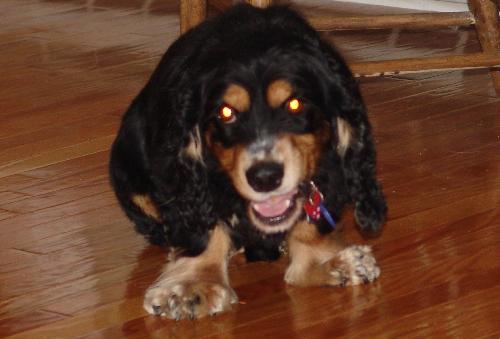 Several weeks ago I stopped by the animal welfare league and could have taken home all the dogs locked up in the cages. I took this one home and to the dog groomer who shaved his long hair off and gave him a good bath. Now I have three dogs all of which I love. I am ready to go back for more but my wife would hit me with the large faying pan so I won't. This dog is really funny but has a little something in him because he likes all of her shoes, cardboard boxes and most everything he can get into his mouth. So I took this picture of him and you can see in his eyes he is the devil. But I still love him just hope he grows up a little. Until then we have to put all things important up and out of his reach. |