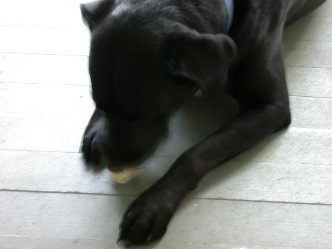 Ben, my super-model dog, chews a bone with great intensity.