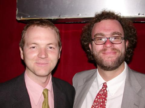 Poets Matthew Rhorer and Joshua Beckman at their Barbés reading in Brooklyn. Halloween, 2003.