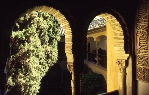 On the right of this photo, you can see that the walls are carved with Arabic poetry, as are all of the walls in the Alhambra. |