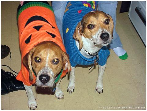 mac (sir macintosh) is on the left, and buck (count buckula) is on the right. this is the last time we tried to put silly sweaters on them. they didn't like it one bit.