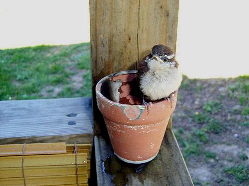 Lonesome bird. I found his brothers and sisters in the grape arbor and put him with them.